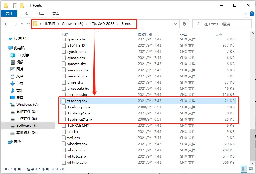 1. Después de descargar la fuente de refuerzo CAD, guárdela en la carpeta 【Fuentes】 del directorio de instalación de GstarCAD . Vea la imagen a continuación: